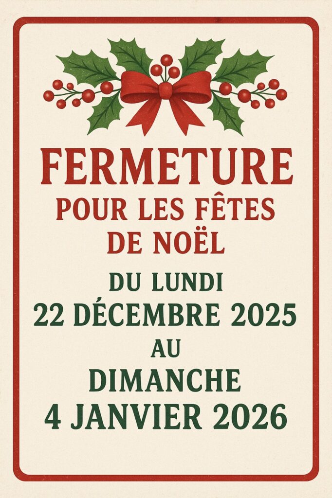 Nous serons fermé du 22 décembre au 4 janvier 2026.